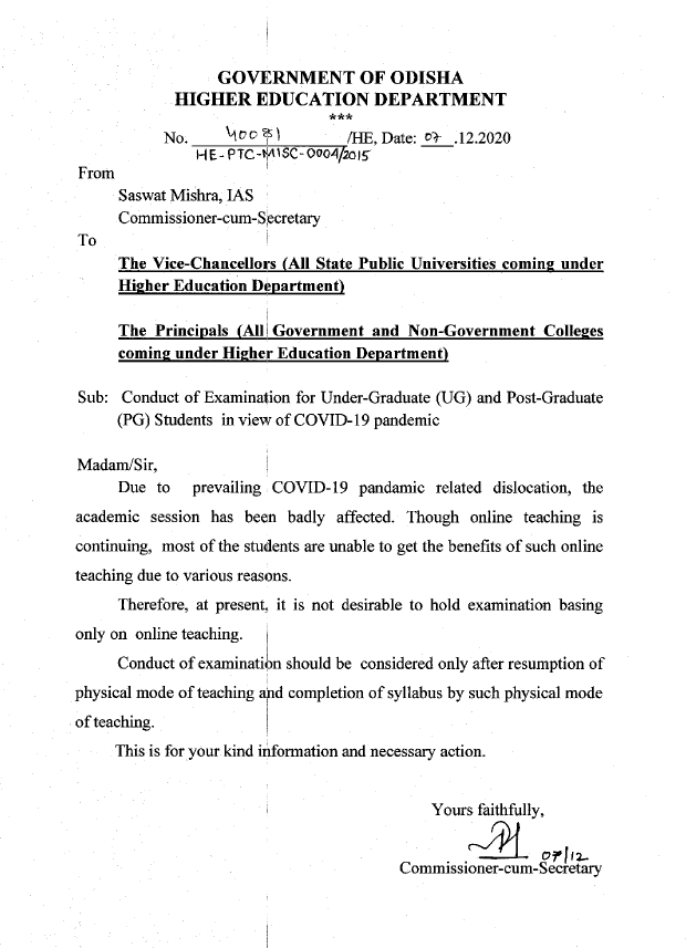 The Odisha Higher Education Department decided to cancel the conduction of the undergraduate (UG) and postgraduate (PG) examinations for the 2020-21 session. According to the reports, the decision to cancel the UG and PG exams is taken due to the “prevailing COVID-19 pandemic related dislocation”. The Higher Education Department will consider holding the examinations for the UG and PG students after the physical mode of teaching resumes and the syllabus completes by such mode of teaching. A Higher Education Department Odisha statement said, “Though online teaching is continuing, most of the students are unable to get the benefits of such online teaching due to various reasons. Therefore, at present, it is not desirable to hold examinations based only on online education.”