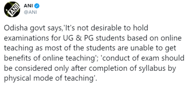 Meanwhile, an official tweet from a reputed media platform stated, “Odisha govt says,'It's not desirable to hold examinations for UG & PG students based on online teaching as most of the students are unable to get benefits of online teaching'; 'conduct of exam should be considered only after completion of the syllabus by physical mode of teaching'.”