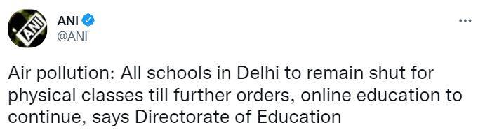 A similar was issued by the Delhi government last week stating the closure of schools and suspension of offline classes until further order due to air pollution. Through the order, the Delhi government informed that the institutions, which were just beginning to open after remaining closed amid the ongoing deadly COVID pandemic, will have to again go back to conducting classes via online mode until further order.