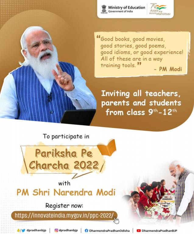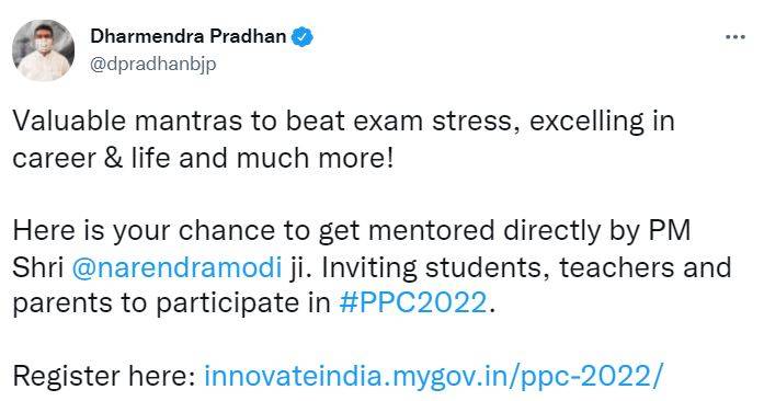Education Minister Dharmendra Pradhan in his latest tweet said, "Valuable mantras to beat exam stress, excelling in career and life and much more. Here is your chance to get mentored directly by PM Shri @narendramodi ji. Inviting students, teachers and parents to participate in #PPC2022."