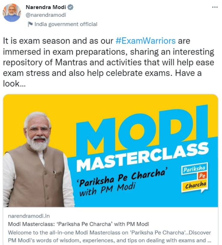 “It is exam season and as our #ExamWarriors are immersed in exam preparations, sharing an interesting repository of Mantras and activities that will help ease exam stress and also help celebrate exams,” PM tweeted.