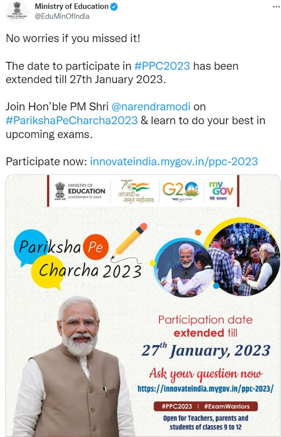 PPC 2023 Deadline Extended! The Ministry of Education has announced the extension of the deadline for Pariksha Pe Charcha. Exam warriors who have not registered yet must note that the application window is now open until January 27, 2023. “No worries if you missed it! The date to participate in #PPC2023 has been extended till 27th January 2023. Join Hon’ble PM Shri @narendramodi on #ParikshaPeCharcha2023 & learn to do your best in upcoming exams. Participate now: https://innovateindia.mygov.in/ppc-2023”