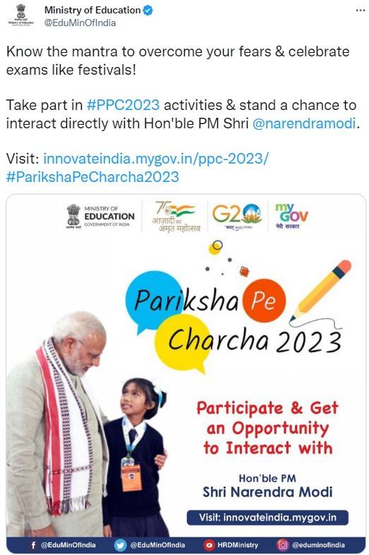The Education Minister through its official Twitter handle has invited students, teacher and parents to participate in PPC 2023 in large number. “Know the mantra to overcome your fears and celebrate exams like festivals!,” the official tweet reads.