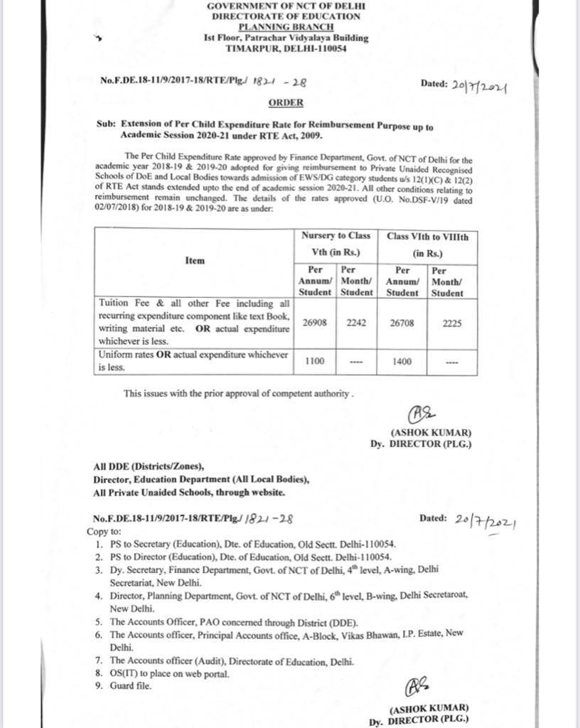 Directorate of Education, Government of NCT of Delhi, released an official notification regarding the ‘Extension of per Child Expenditure Rate for Reimbursement Purpose up to Academic Session 2020-21 under RTE Act 2009’. The notice states that the department has extended the per-child expenditure rate for reimbursement purposes up to the end of academic session 2020-21. The notice also stated clearly that there is no change in all the other conditions related to this reimbursement.
