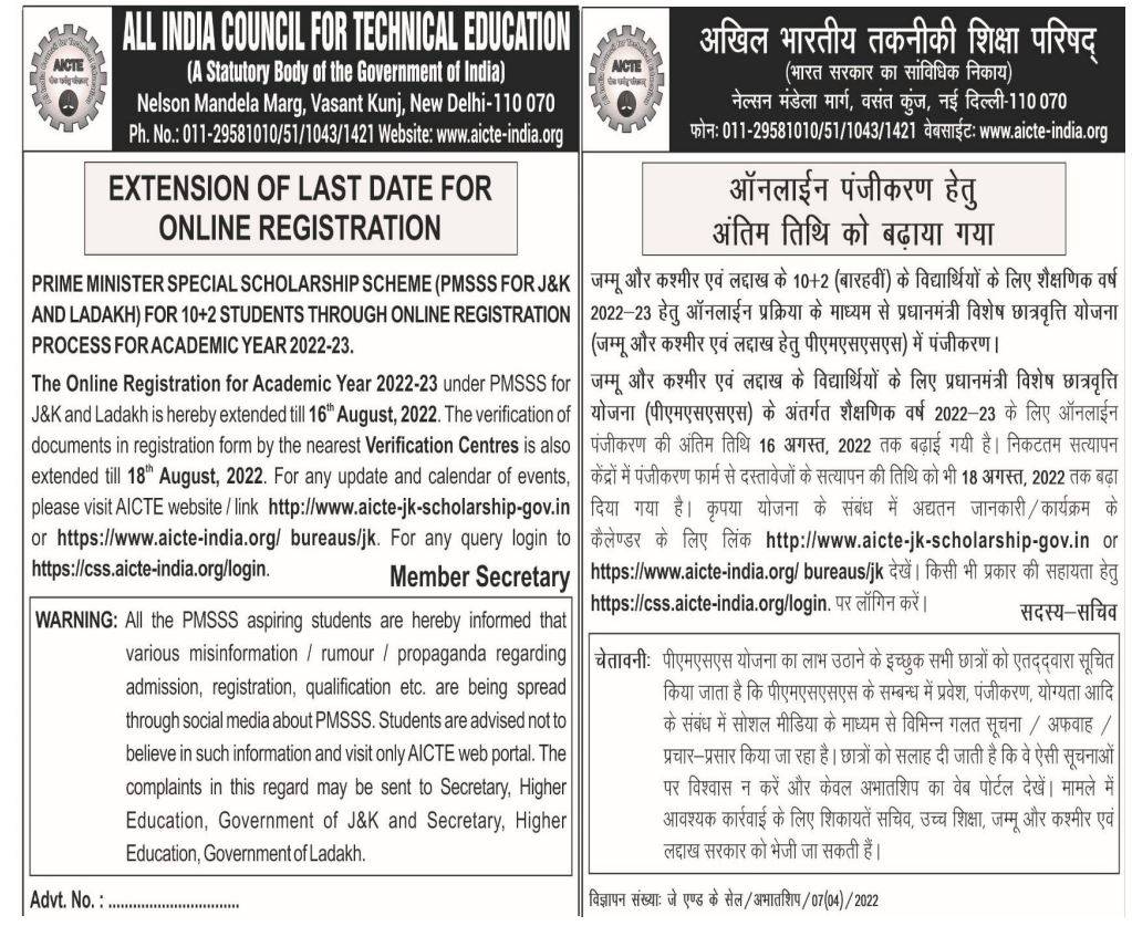 The official notification released regarding the extension of the registration deadline further reads, “ All the PMSSSaspiring students are hereby informed that various misinformation/rumor/propaganda regarding admission, registration, qualification, etc. are being spread through social media about PMSSS. Students are advised not to believe in such information and visit only AICTE web portal. The complaints in this regard may be sent to secretary, higher education, government of J&K and Secretary, higher education, government of Ladakh.”