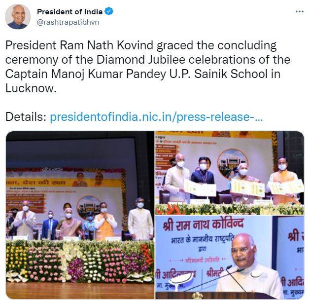 It further states, “Remembering Captain Manoj Kumar Pandey, the President said that we would always be indebted to him and his family for his sacrifice to protect the borders of the nation. Captain Manoj Kumar Pandey has written a wonderful and immortal saga of valor and sacrifice. He is the only soldier among the students of all Sainik Schools who has been decorated with the Param Vir Chakra.”