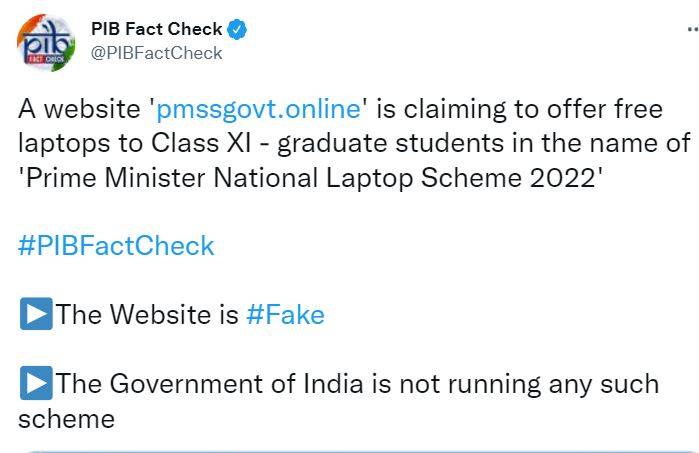 PIB took to Twitter and said: A website 'pmssgovt.online' is claiming to offer free laptops to Class 11 - graduate students in the name of Prime Minister National Laptop Scheme 2022.”
