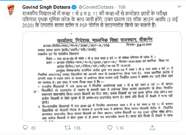 Rajasthan State Education Minister Govind Singh Dotasra has said that all the students of class 1 to 8, 9 and 11, studying in government schools will receive their promotion certificates after May 3. Students can download the same once the lockdown is uplifted.
