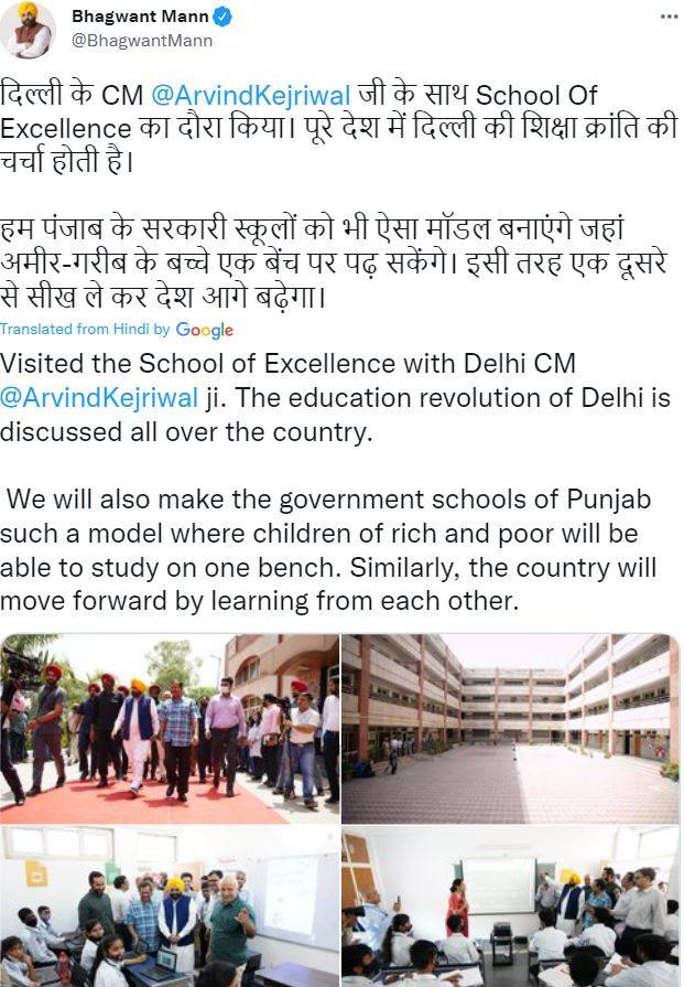 Bhagwant Mann through his official Twitter handle said, Visited the School of Excellence with Delhi CM Arvind Kejriwal ji. The education revolution of Delhi is discussed all over the country. We will also make the government schools of Punjab such a model where children of rich and poor will be able to study on one bench. Similarly, the country will move forward by learning from each other.”