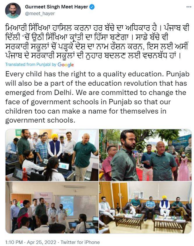 Gurmeet Singh Meet Hayer, Cabinet Minister Government Of Punjab tweeted, “Every child has the right to a quality education. Punjab will also be a part of the education revolution that has emerged from Delhi. We are committed to change the face of government schools in Punjab so that our children too can make a name for themselves in government schools.”