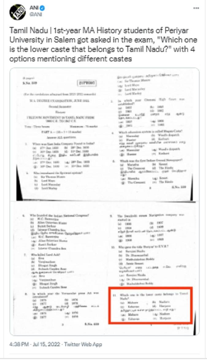 Periyar University's first-year Masters in History students were asked 'Which one is the lower caste belongs to Tamil Nadu (sic)?' during the examination with the four options Mahars, Nadars, Ezhavas and Harjans. Following the question in the second-semester examination, for the paper titled Freedom Movement in Tamil Nadu from 1880 CE to 1947 CE, now Tamil Nadu's higher education department has announced that it will investigate the matter.