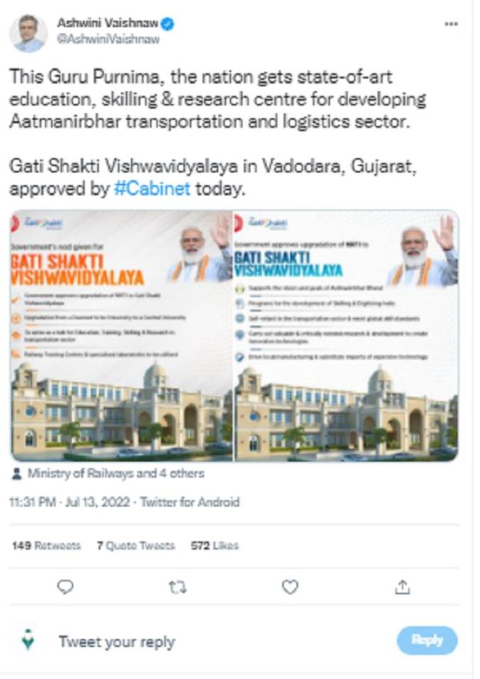 Union Minister for Railways, Ashwini Vaishnaw also tweeted from his personal handle, "This Guru Purnima, the nation gets state-of-art education, skilling & research centre for developing Aatmanirbhar transportation and logistics sector. Gati Shakti Vishwavidyalaya in Vadodara, Gujarat, approved by #Cabinet today."