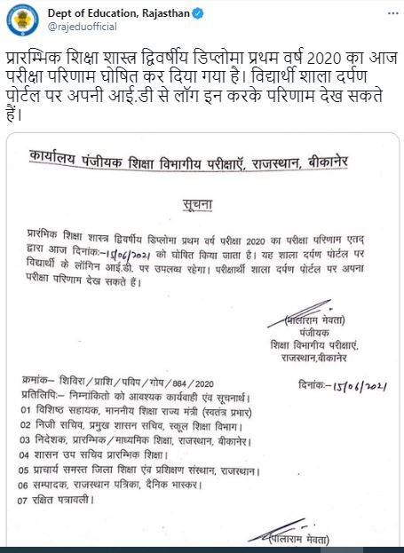 Informing the declaration of Rajasthan D.El.Ed. First Year 2020 Results, the state education department took to its official Twitter handle. In its official tweet, the department said: βToday the examination result of Elementary Education Two Year Diploma First Year 2020 has been declared. Students can check the result by logging in with their ID on the Shala Darpan portal.β Check the official tweet below: