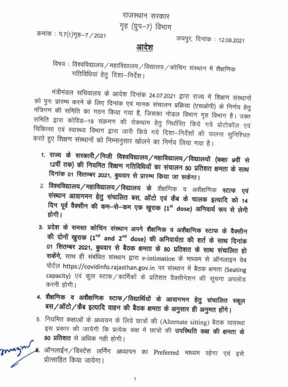 Rajasthan government in the SOPs made this clear that the teachers, staff, drivers and others in colleges and universities must receive their first dose of vaccination before reopening. Drivers of cabs, buses, and autos for school children are required to be vaccinated 14 days in advance with at least the first dose.