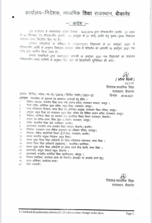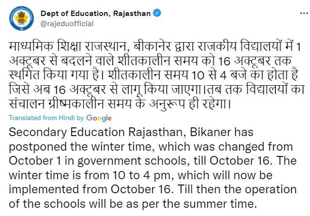 According to the official tweet posted by the Department of Education, Rajasthan, “Secondary Education Rajasthan, Bikaner has postponed the wintertime, which was changed from October 1 in government schools, till October 16. The wintertime is from 10 to 4 pm, which will now be implemented from October 16. Till then the operation of the schools will be as per the summertime.”