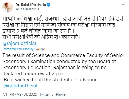 RBSE 12th Result 2022 Date and Time announcement was done yesterday by Education Minister BD Kalla