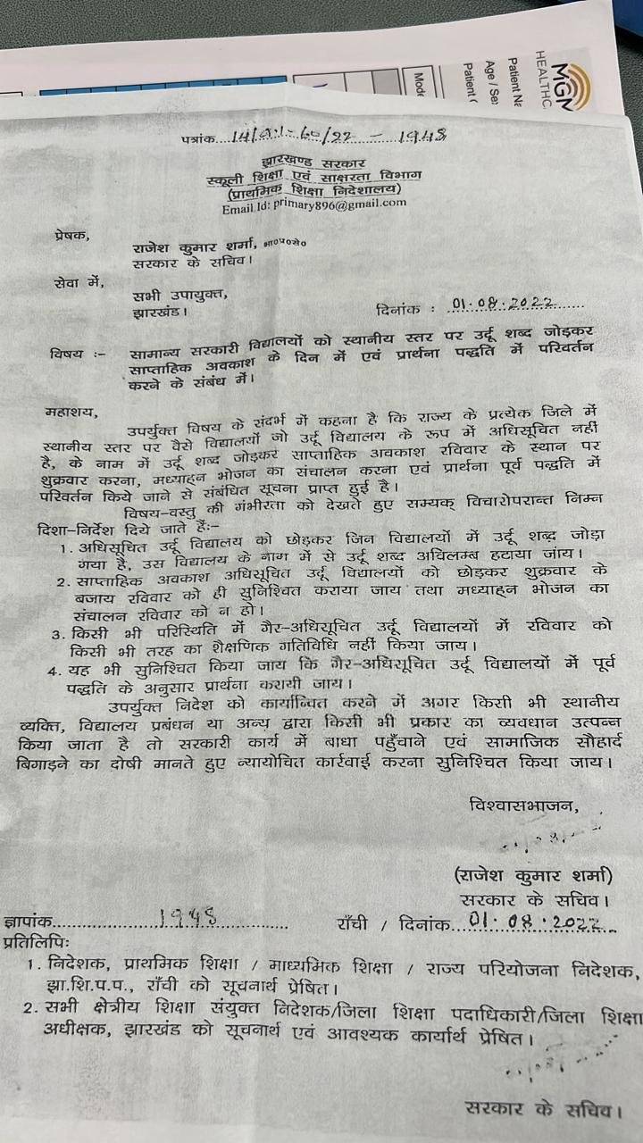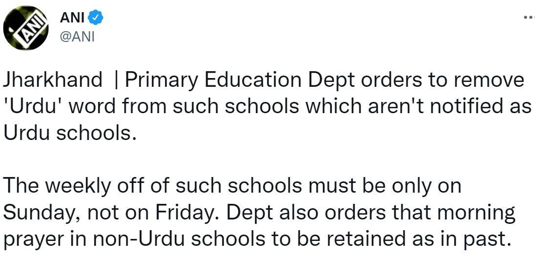 The Directorate of Primary Education under the Department of School Education and Literacy issued an official order on August 1 to remove the word ‘Urdu’ from the schools that have not been notified as Urdu Schools. The order released by the department further directed such schools to keep the weekly holiday on Sunday and not on Friday, as these schools have started observing.