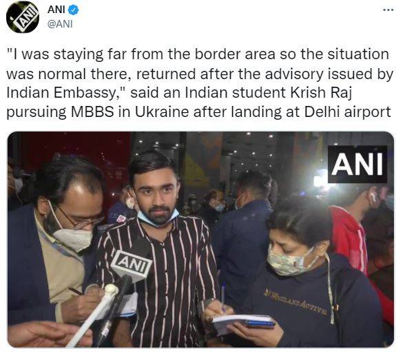 "I was staying far from the border area so the situation was normal there, returned after the advisory issued by Indian Embassy," said an Indian student Krish Raj pursuing MBBS in Ukraine after landing at Delhi airport