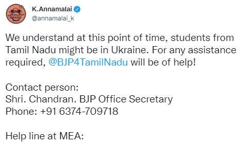 BJP State president K Annamalai through his official Twitter handle announced that the BJP government has started a helpline to assist students from Tamil Nadu stuck in Ukraine. The politician said, “We understand at this point of time, students from Tamil Nadu might be in Ukraine. For any assistance required, @BJP4TamilNadu will be of help! Contact person: Shri. Chandran. BJP Office Secretary; Phone: +91 6374-709718.”