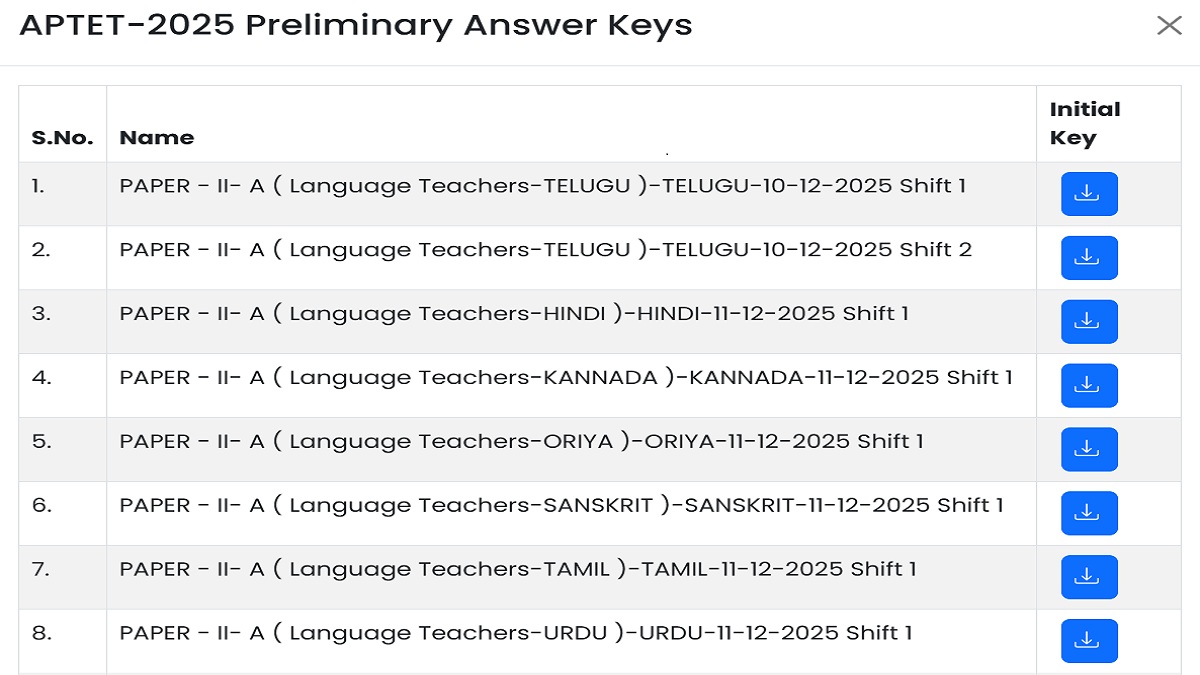 AP TET Answer Key 2025: Department of School Education, Government of Andhra Pradesh has released AP TET 2025 preliminary answer keys for teachers eligibility exam. Candidates can download AP TET answer keys from official website aptet.apcfss.in. They do not have to use any login details, as initial AP TET answer key is available in PDF format for paper 1 and 2. They must note that as of now only Languages including Telugu, Kannada, Hindi, Oriya, Sanskrit, Tamil and Urdu answer key has been released.