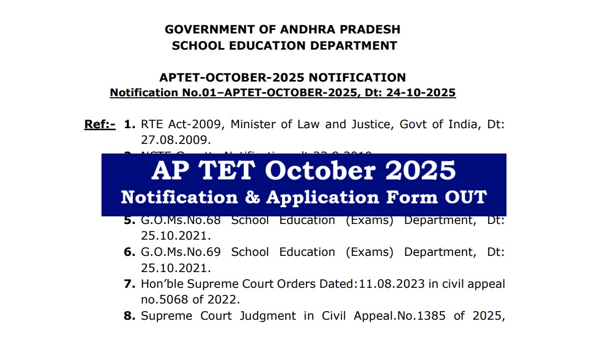 The Department has released the notification for the AP TET Oct 2025 examination. Download the APTET notification here: