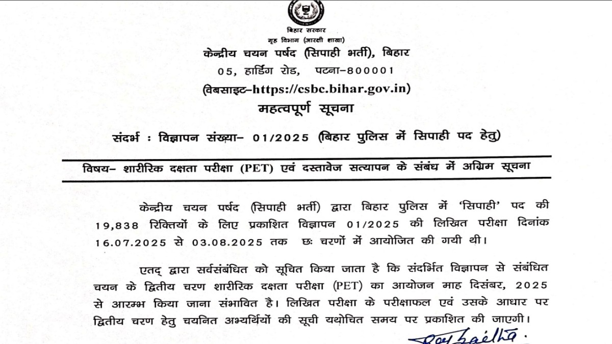 केंद्रीय चयन बोर्ड कांस्टेबल (CSBC), बिहार ने एक नोटिस जारी कर सूचित किया है कि बिहार पुलिस कांस्टेबल पीईटी (PET) और दस्तावेज़ सत्यापन संभवतः दिसंबर 2025 में आयोजित किया जाएगा।