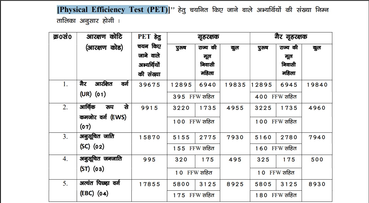 केंद्रीय चयन बोर्ड कांस्टेबल (CSBC), बिहार ने एक नोटिस जारी कर सूचित किया था कि बिहार पुलिस कांस्टेबल पीईटी (PET) और दस्तावेज़ सत्यापन संभवतः दिसंबर 2025 में आयोजित किया जाएगा।