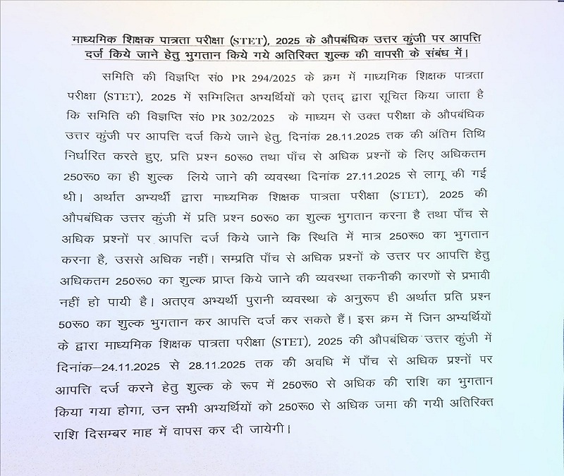BSEB has confirmed that extra amount paid beyond INR 250 will be refunded to all eligible candidates in December 2025. Earlier, through notification PR 302/2025, last date for submitting objections to Bihar STET answer key was November 28, 2025.Β A revised fee structure was also announced, which stated INR 50 per question for raising objection will be charge.Β
