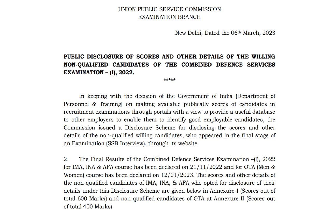 Union Public Service Commission (UPSC) released the list of disqualified candidate's list for the CDS 1 2022 exam on March 6, 2023. A total of 649 candidates were disqualified for IMA, INA, and AFA and 690 for OTA (Men and women) in CDS 1, 2022 exam. The PDF list comprises the candidate's name, father's name, date of birth, educational qualification, complete address, gender, community, total marks obtained, and email Id.