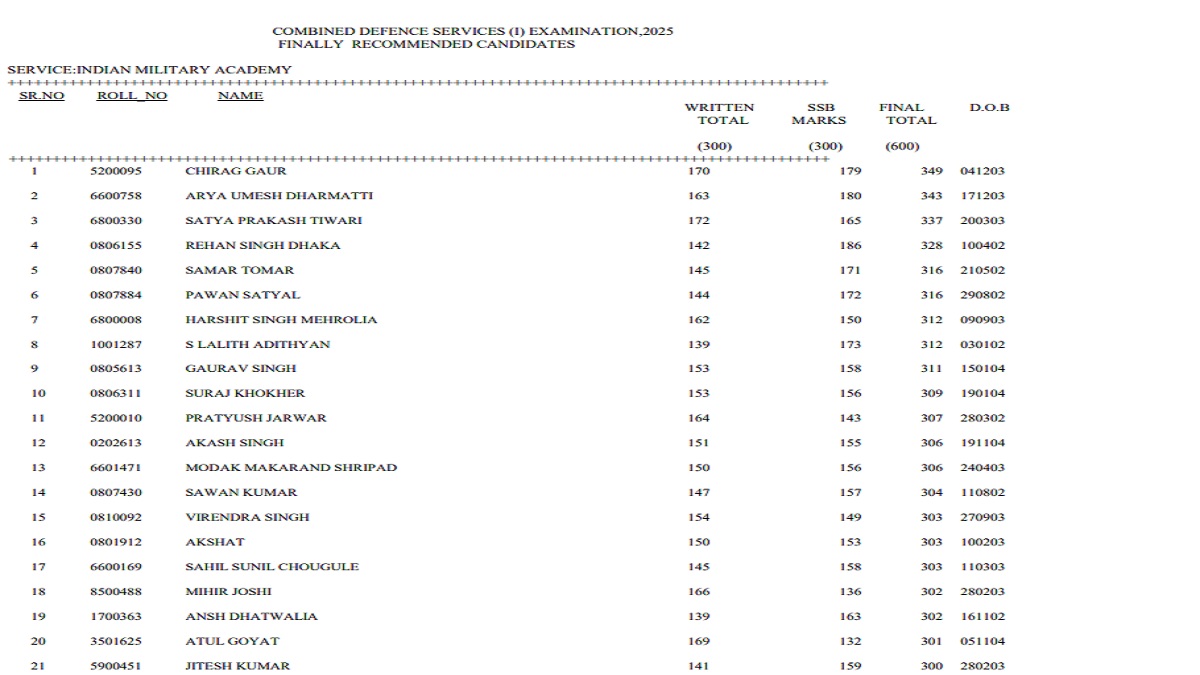 CDS I marks list 2025 includes candidate’s roll number, name, scores from written exam, SSB interview, and overall marks. The CDS I final result was announced on October 12, 2025.