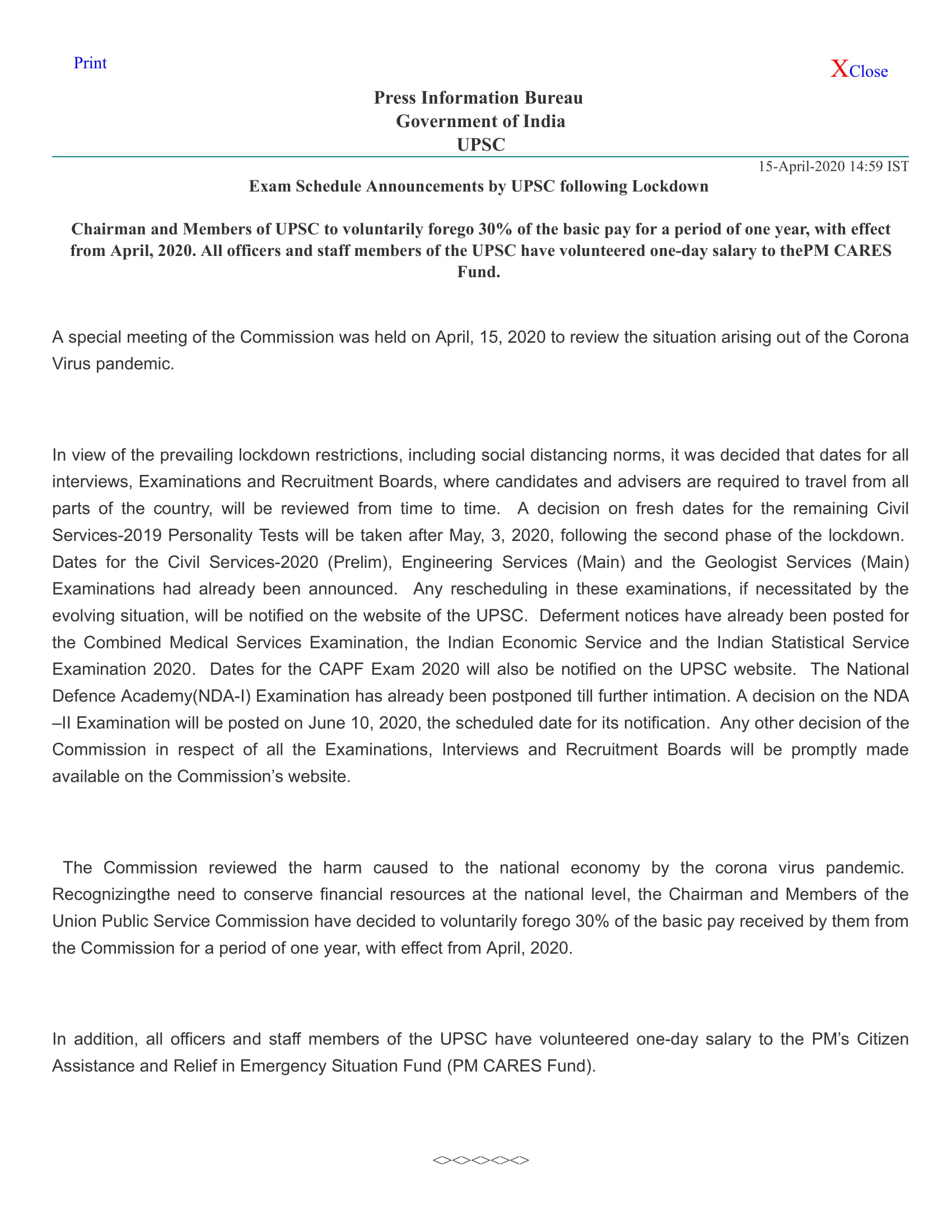 The press release stated “A decision on fresh dates for the remaining Civil Services -2019 Personality Tests will be taken after May 3, 2020, following the second phase of the lockdown. Dates for the Civil Services- 2020 (Prelim), Engineering Services (Main) and the Geologist Services (Main) Examinations had already been announced. Any re-scheduling in these examinations, if necessitated by the evolving situation, will be notified on the website of the UPSC.”