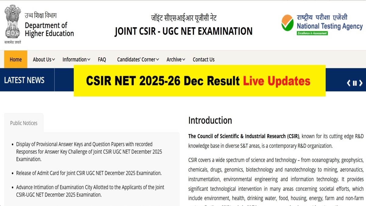 CSIR NET 2025-26 Result Live Updates: The National Testing Agency (NTA) is expected to soon declare the CSIR NET 2025 result for the December session. It will be released at csirnet.nta.nic.in in the form of PDF. Those candidates who appeared for the exam on December 18 will be able to check their result online. It will consists of the roll number and rank of all the qualified candidates for award of JRF and eligible for Assistant Professor. Along with the CSIR NET result, the scorecard and final answer key will also be released for all the subjects. Candidates need to use their login credentials to check the result. Scroll down for the latest live updates about the CSIR NET Dec Result 2025-26.