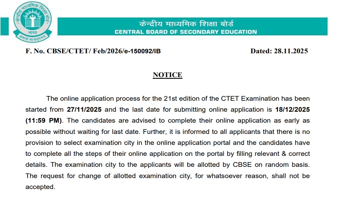 Central Board of Secondary Education has released a notice stating that CTET application portal does not include option to select exam city. Hence, applicants are advised to complete all steps by providing accurate details. CTET exam city allocation will be done randomly by CBSE.