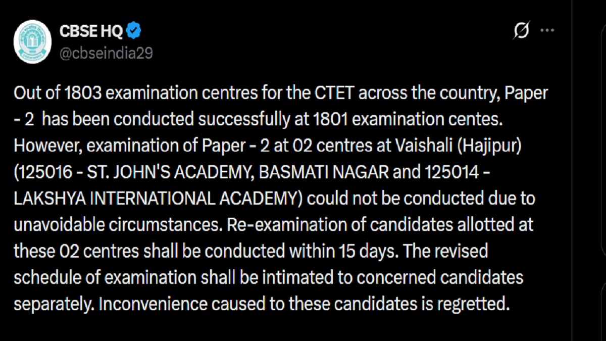 CBSE CTET 2026 Paper 2 re-exam will be held at 2 centres in Bihar. As per tweet by CBSE, it was mentioned that CTET paper 2 re-exam 2026 will be conducted within 15 days. Check details here