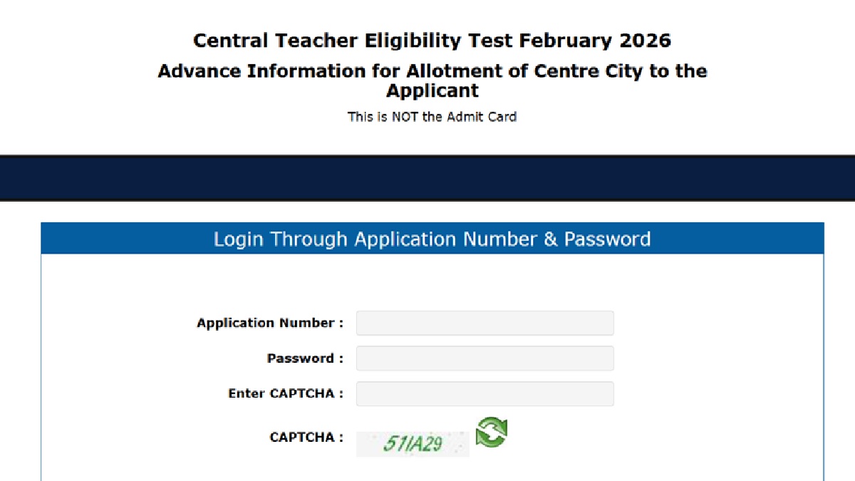 Central Board of Secondary Education (CBSE) has released the pre admit card or exam city allotment slip for CTET February 2026 exam. The CTET exam city check 2026 link has been activated on the exam website- ctet.nic.in. Candidates who registered for the exam can download the CTET exam city/ pre admit card 2026 using their login details. The CTET pre admit card informs the candidates about the allotted exam city wherein their exam centre will be located. The CTET 2026 pre admit card also contains the exam date. Candidates must download their slips using the direct CTET exam city 2026 link shared below.