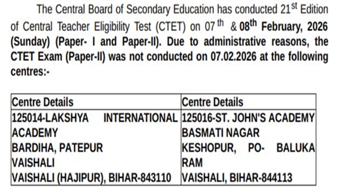 Due to administrative reasons, the CTET paper 2 could not be held at two exam centres in Bihar. CBSE has now decided to conduct the paper 2 on March 1, 2026 at these two centres.Â