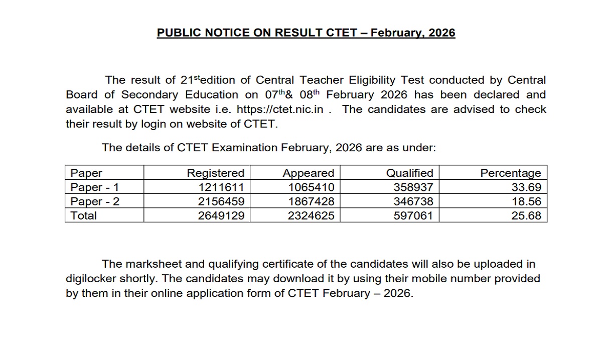 In CTET February 2026 result, 5.97 lakh candidates qualified with overall pass percentage of 25.68%. Check CTET 2026 paper 1 and 2 result statistics here