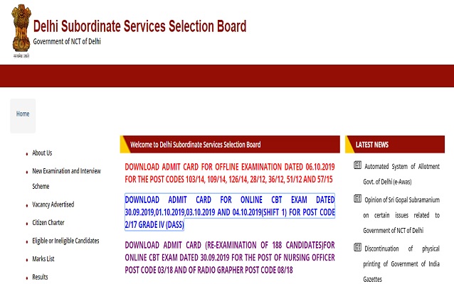The Delhi Subordinate Services Selection Board (DSSSB) has released DSSSB admit card 2019 for online exam dated September 30, October 1, 3 and 4 for the post of Grade-IV (DASS) (post code – 2/17). It may be noted that the board released Grade-IV (DASS) admit card for online exam conducted on September 20 and 24 earlier. Read: DSSSB admit card 2019 for Grade-IV (DASS) & other post codes out.