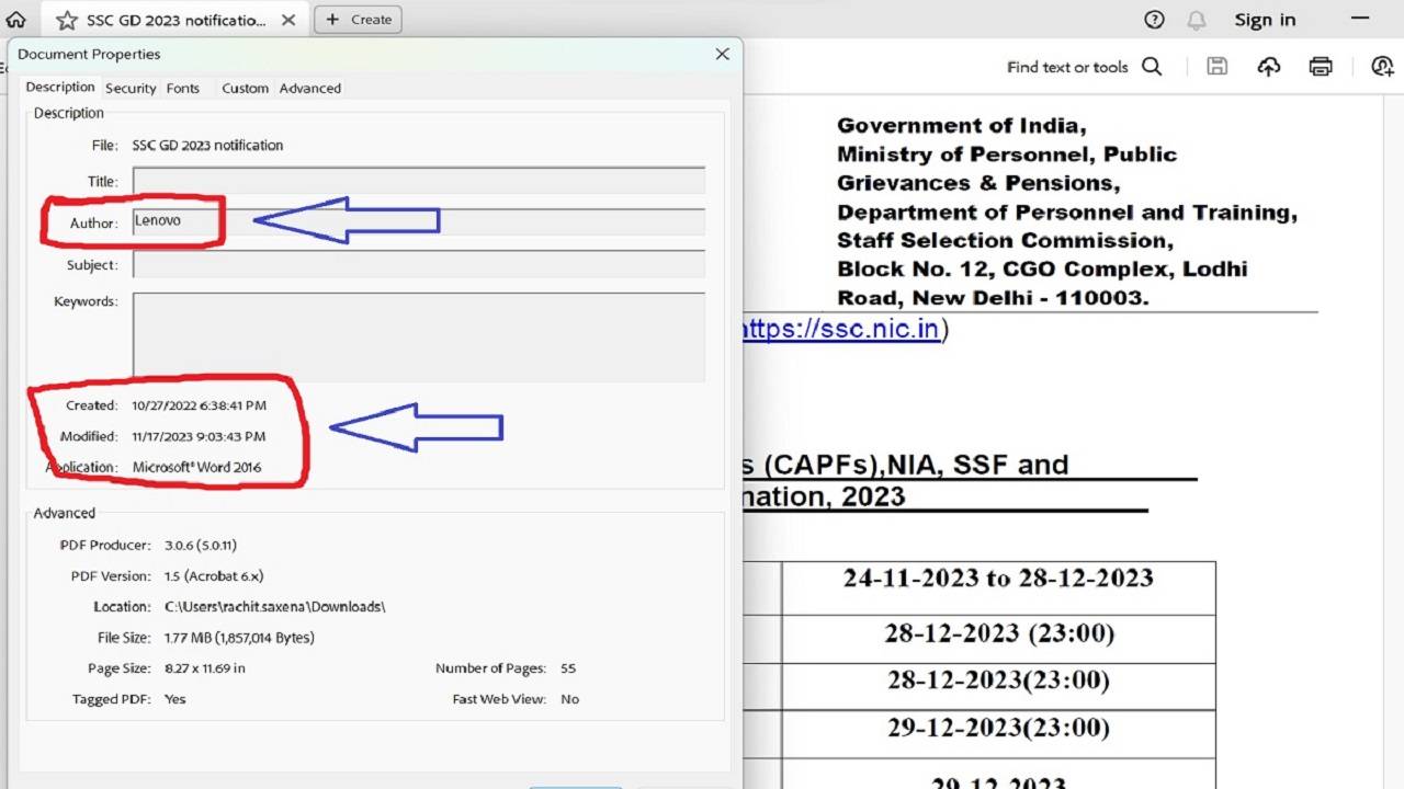 After analyzing the FAKE notification for SSC GD 2023 that is making round on the internet, our technical informed that the author of this SSC GD 2023 Notification PDF is “Lenovo”. However, it must be noted that usually, the author is always “SSC” for the official PDFs released by the Commission. Candidates prepping to appear for SSC GC Constable Exam 2023 must check the image given below to understand that the Fake SSC GD Notice PDF was created in 2022 and not in the current year 2023.