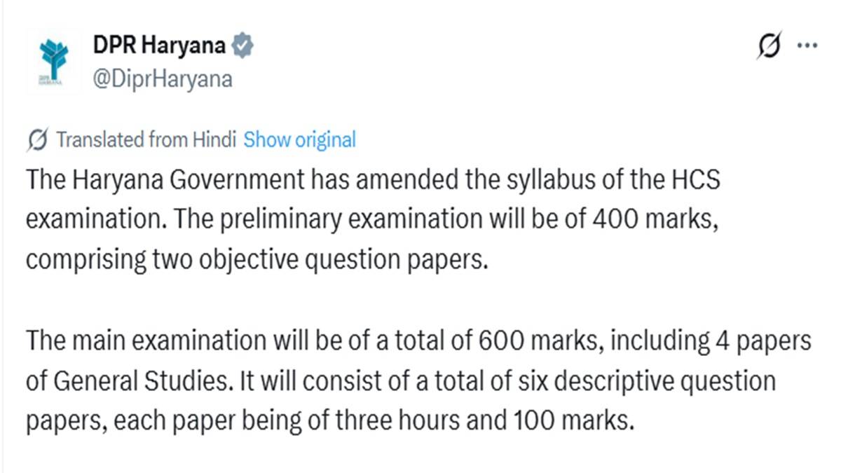 “The Haryana Government has amended the syllabus of the HCS examination. The preliminary examination will be of 400 marks, comprising two objective question papers. The main examination will be of a total of 600 marks, including 4 papers of General Studies. It will consist of a total of six descriptive question papers, each paper being of three hours and 100 marks,” reads a tweet by Haryana DPR.