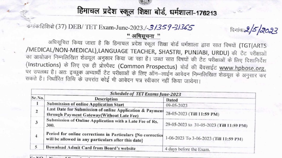 Himachal Pradesh Board of School Education (HPBOSE) has released the official notification for the Himachal Pradesh Teacher Eligibility Test (HP TET) June 2023 session exam. The HP TET registration 2023 will begin on May 9, 2023. Candidates will be given around 20 days to complete the HP TET application form 2023. The last date to submit HP TET application without the late fee is May 28, 2023.