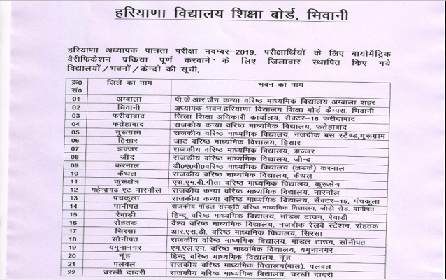 Given below is the list of Biometric Verification Centres for HTET November 2019