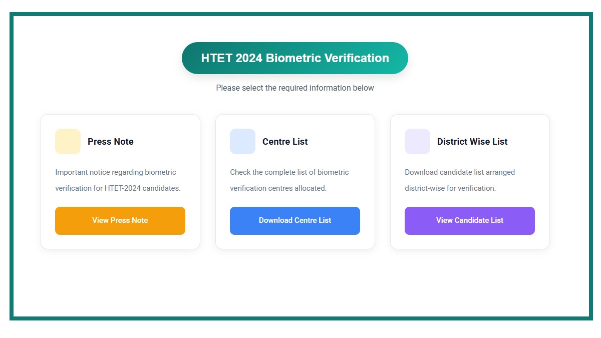 Board of School Education, Haryana (BSEH) has announced the schedule of the biometric verification for the Haryana TET 2024 session exam. The HTET biometric verification will be held from August 25 to 26, 2025, in 22 district centres of Haryana. Candidates can get the HTET biometric list 2025 PDF download link of centres below. The BSEH has also released the detailed district-wise candidates' list who have been called for the HTET biometric verification 2025. The HTET candidate-wise list for biometric verification is shared below. Candidates need to appear for the verification at the allotted biometric centre on August 25 or 26. The BSEH HTET result 2025 will be announced after the successful verification of candidates.