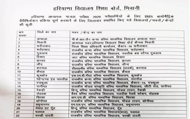Haryana School Education Board (HSEB) has released Iris Bio-metric verification centre list for HTET-2020 on its official website. Candidates can check their names, district, centre code and centre for HTET Level 1, 2 and 3 now. Candidates who appeared for HTET 2020 on January 2 and 3, 2021, must be aware of iris biometric verification centre names based in different districts.