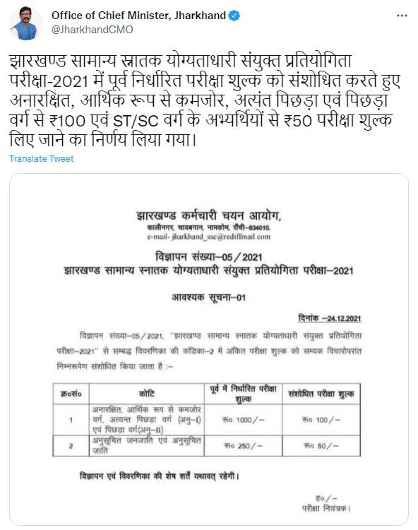 Making the announcement on Twitter, Jharkhand Chief Minister Hemant Soren wrote: βIt was decided to charge Rs 100 from unreserved, economically weaker, extremely backward and backward classes and Rs 50 from ST / SC category candidates, while revising the pre-determined examination fee in Jharkhand General Graduate Qualification Combined Competitive Examination-2021.β
