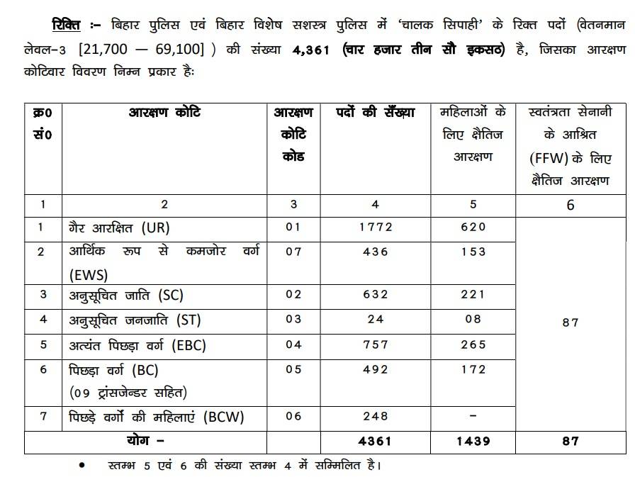 A total of 19838 vacancies are announced, for which an online recruitment process was completed. The Bihar Police Constable Notification pdf under advertisement number 01/2025 was released on March 11, 2025.