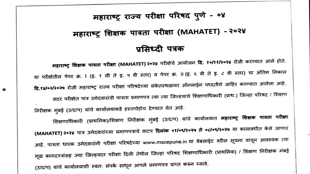 MAHA TET 2024 Certificates: The Maharashtra State Council of Examination (MSCE) has announced the distribution of eligibility certificates for the Maharashtra Teacher Eligibility Test (MAHATET) 2024. As per the dates released, the MAHA TET 2024 certificates can be collected from September 1. The last date to collect the MAHA TET certificates 2024 online is September 8, 2025.