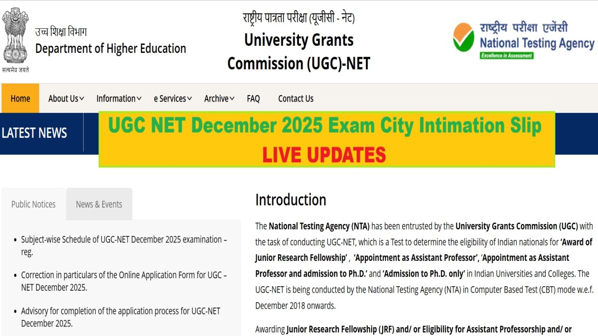 The UGC NET 2025 December City Intimation Slip is expected to be released soon at ugcnet.nta.nic.in. The exam will be conducted from December 31 to January 7, 2026. Scroll down for the latest live updates about the UGC NET City Slip including methods to download, admit card release date, etc.Â