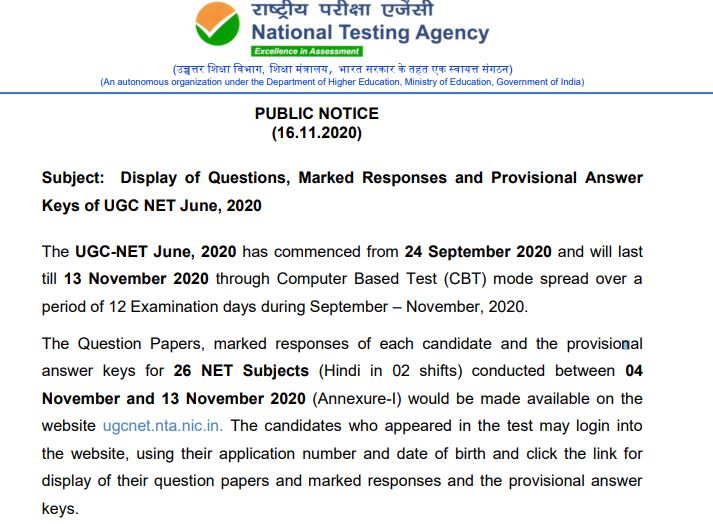 The National Testing Agency (NTA) has released the UGC NET provisional answer key 2020 for all the remaining 26 subjects for which the exam was conducted from November 4-13. Along with the answer key, the agency has also released the UGC NET question papers and marked responses of candidates.