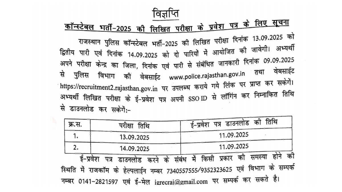 The Rajasthan Police Constable exam will be held on September 13 and 14, 2025.